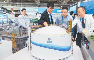 11月29日,在北京举行的首届中国国际供应链促进博览会上,参观者了解中海石油独创的拥有自主知识产权的全容式液化天然气(LNG)储罐。