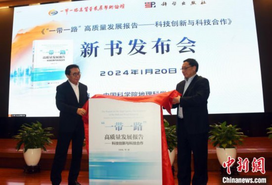 1月20日,“一带一路”高质量发展学术论坛第三届年会在北京举行,作为年会一项重要成果,由白春礼院士领导编著的《“一带一路”高质量发展报告——科技创新与科技合作》重磅首发。图为白春礼院士(左)和科学出版社负责人共同为新书首发揭幕。中新网记者 孙自法 摄